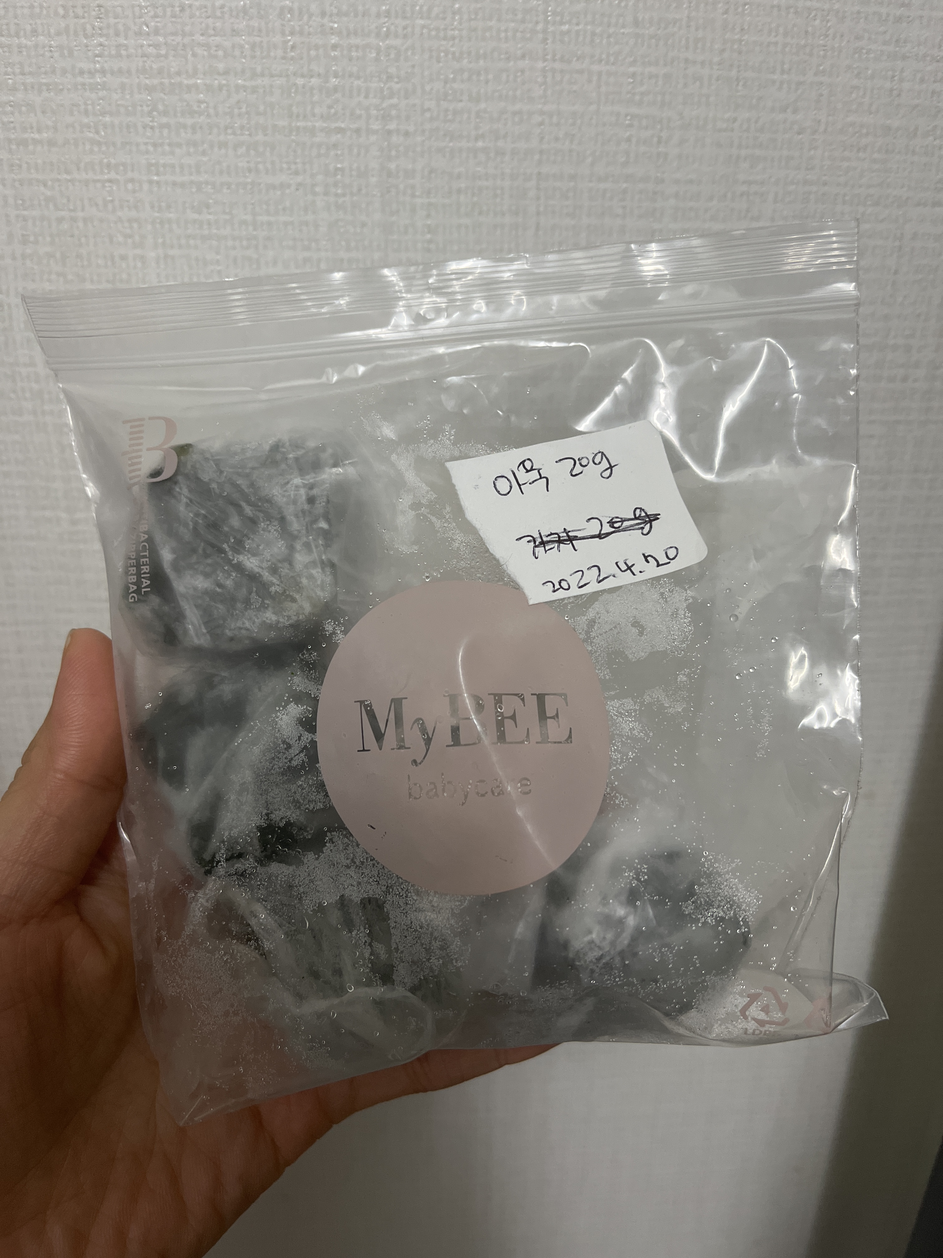 7) 다음 날 냉동된 큐브를 하나씩 꺼내어 랩에 싼 후 큐브를 만든 날짜를 적어 지퍼백에 보관한다