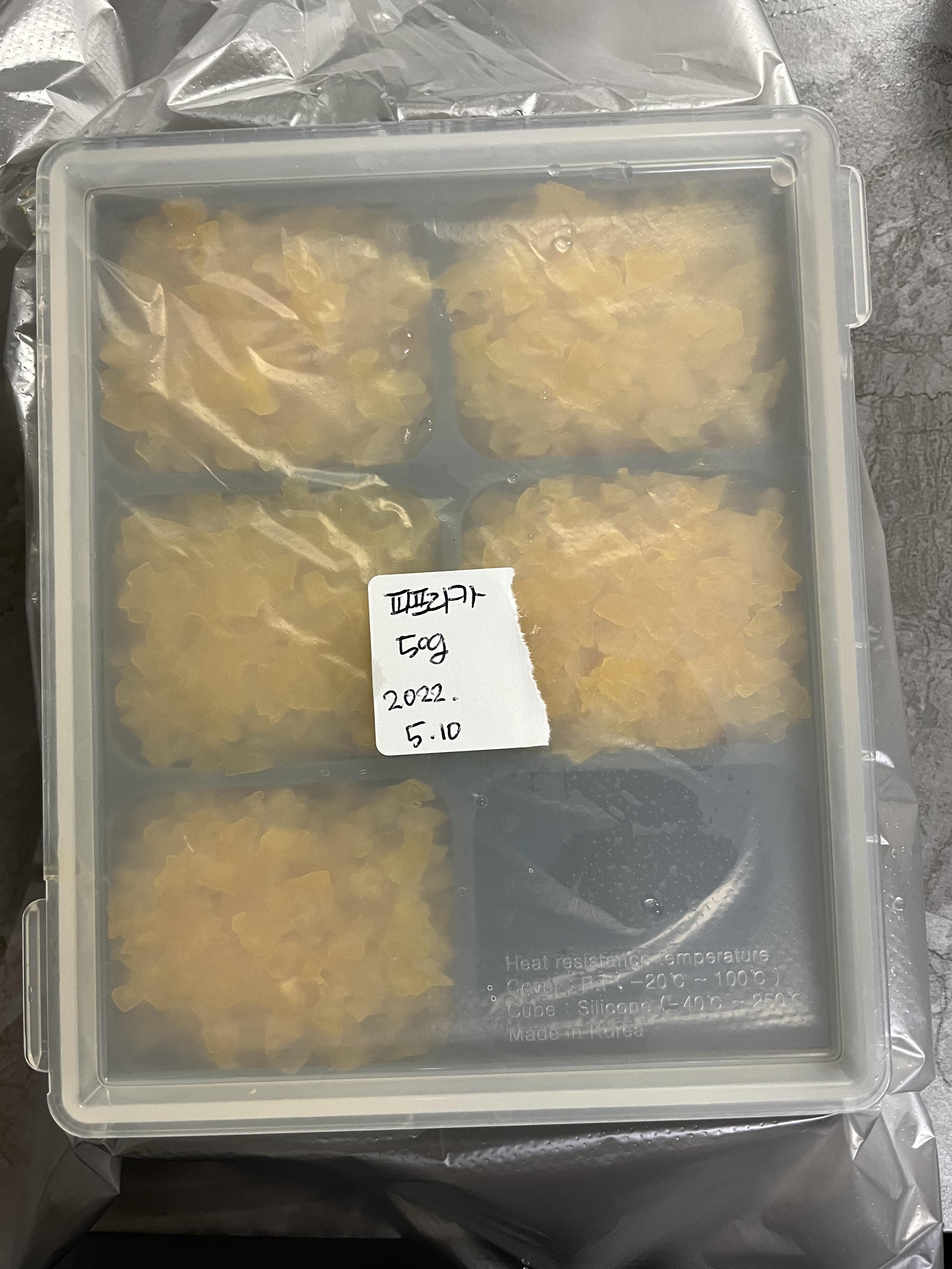 5) 다음 날 냉동된 큐브를 하나씩 꺼내어 랩에 싼 후 큐브를 만든 날짜를 적어 지퍼백에 보관한다.