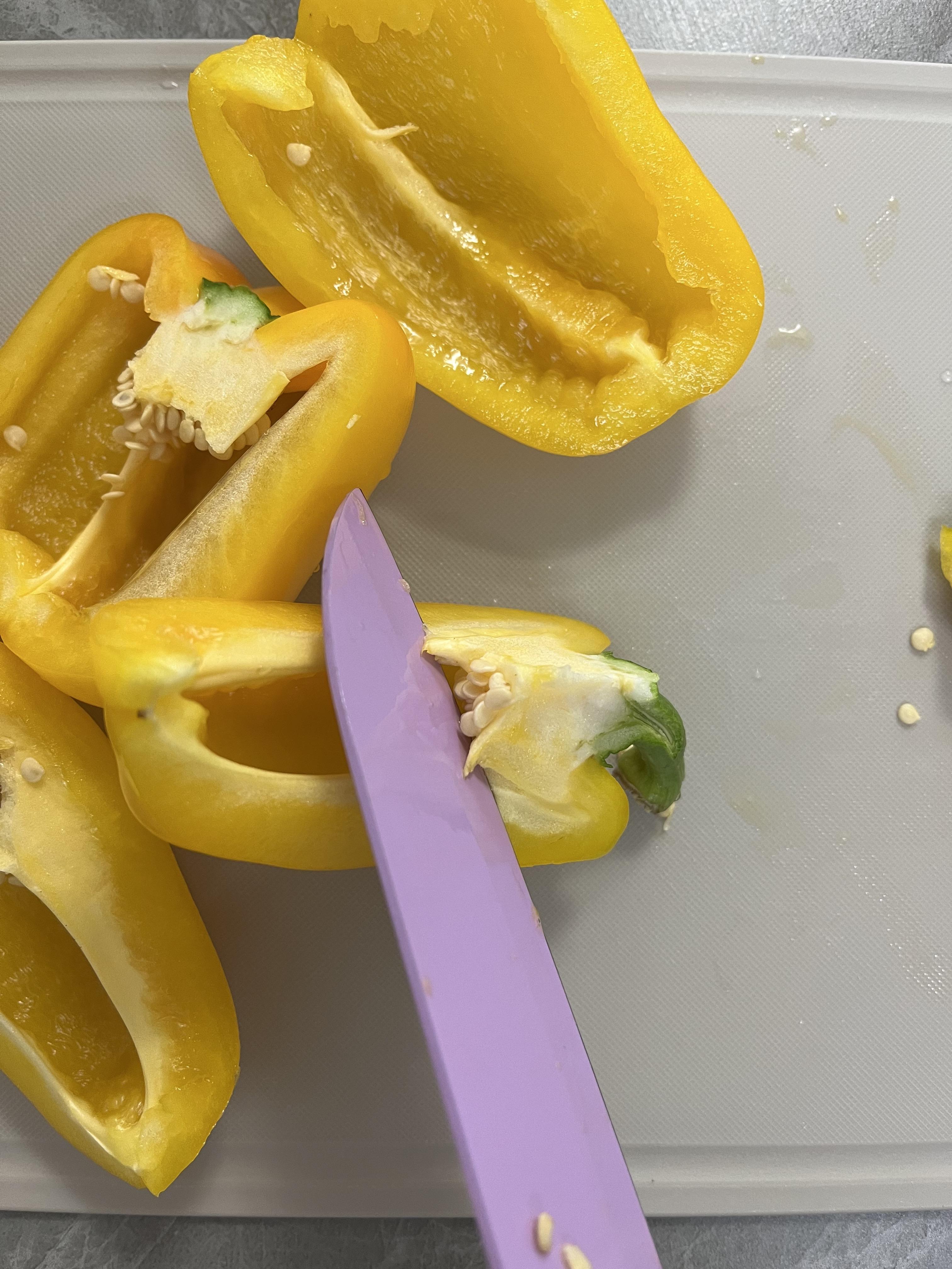 1) 파프리카를 깨끗이 씻고 반을 갈라 씨와 꼭지를 제거한다.