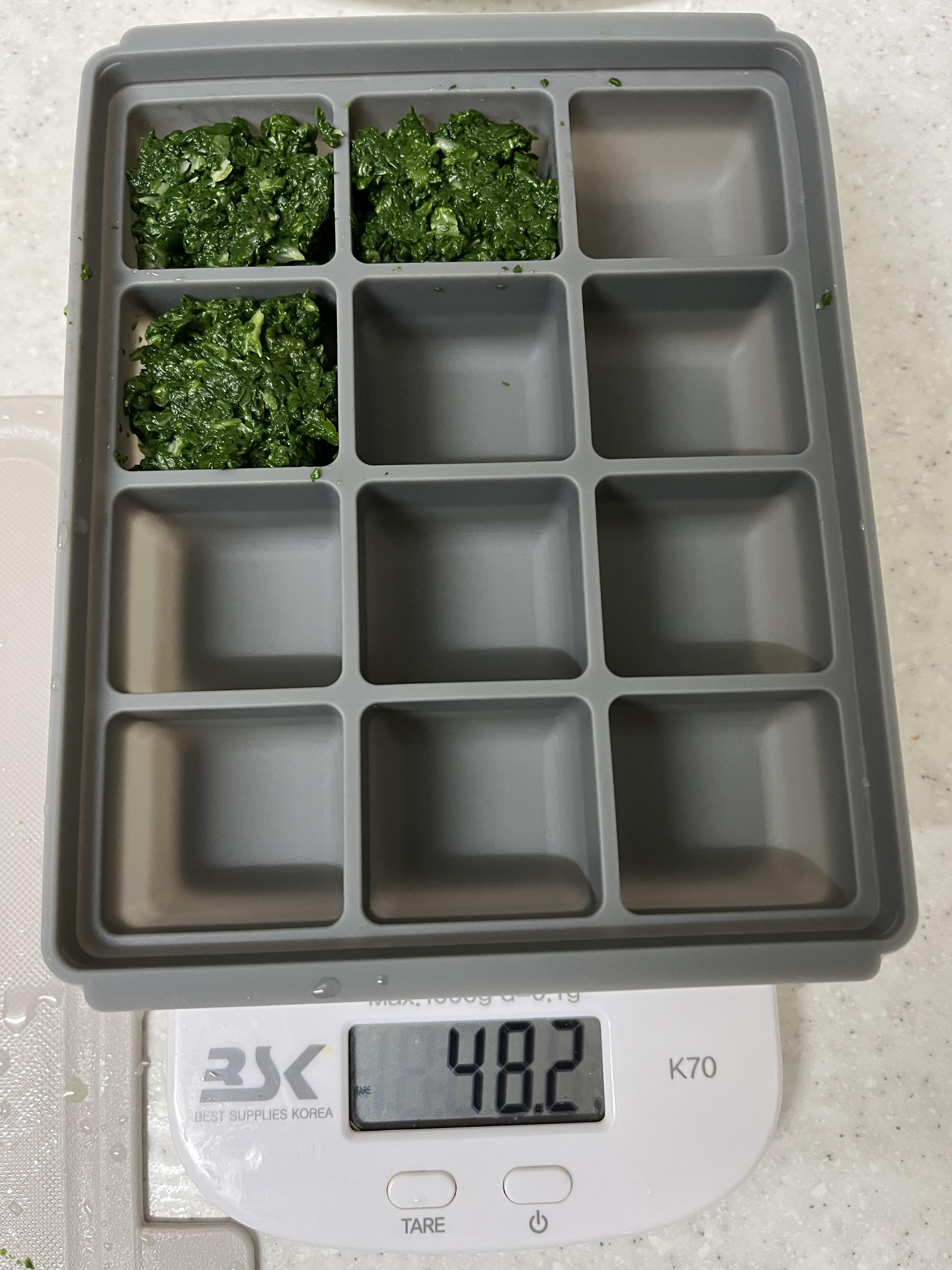 4) 이유식용 큐브에 다진 근대를 담는다.