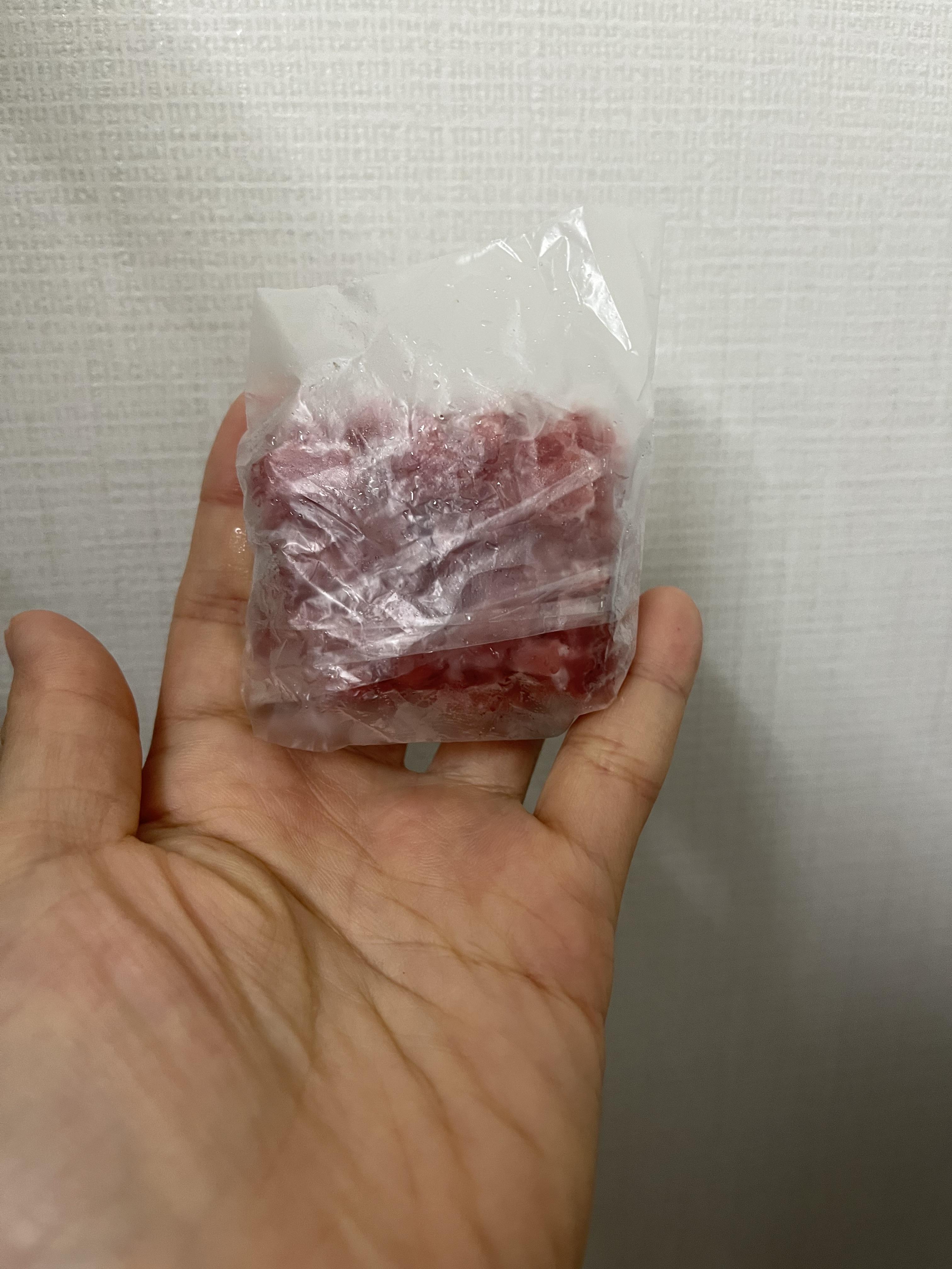 4) 잘게 자른 소고기를 담은 큐브 위에 비닐이나 랩을 씌우고 뚜껑을 닫아 하루 동안 냉동실에 넣어 둔다.